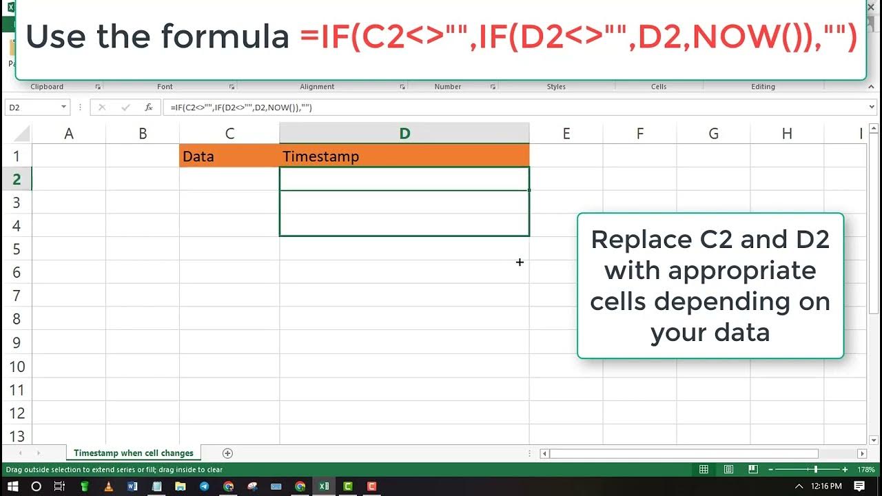 #exceltips #excelcourse #Exceltimestamp In this video, you will learn how to inset a timestamp automatically when a cell changes. Download the Workbook used from this website. https://excelweez.com/how-to-timestamp-in-excel-when-cell-changes/ The formula used is available on the page above remember to change C2 and D2 cell accordingly. Replace D2 with the cell that will hold timestamp. Additionally, C2 is the cell that will change.